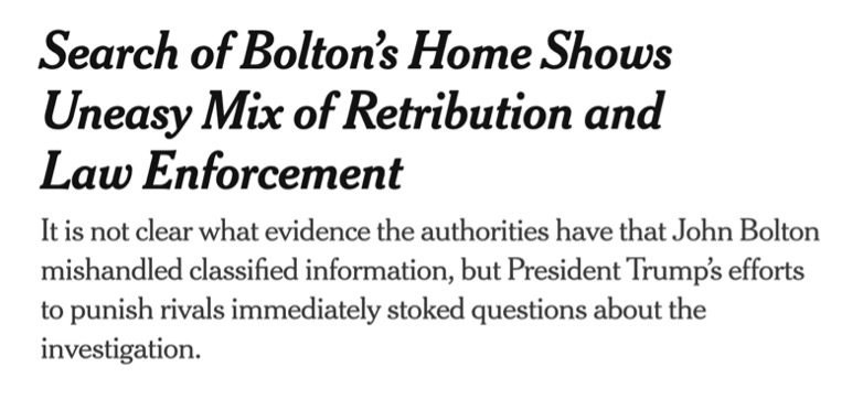 As noted above, the FBI raid on John Bolton’s home and office is troubling, disturbing, disconcerting, worrisome, or, perhaps, dangerous. But the New York Times, looking, as always, for the most neutral of language, referred to it this way: |
